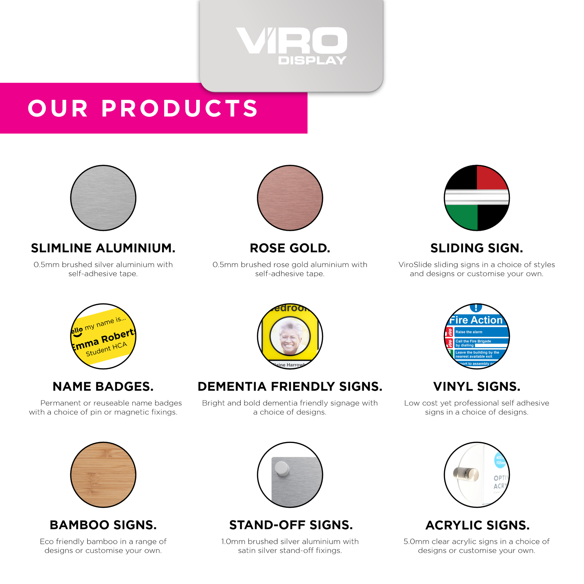 If you’re searching for a unique, tailor-made signage solution, you’ve come to the right place. At Viro Display, we specialise in creating custom signs to meet any need. Whether you require office door signs, plaques, wall signs, sliding signs, toilet signs, or any other type of signage, our expert team is here to help. We can create bespoke sizes, use different materials and print whatever you want.
