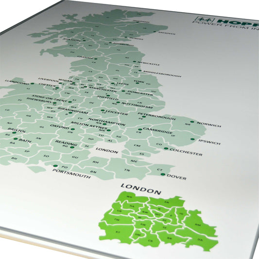 Bespoke printed whiteboard for battery specialist, Hoppecke. A 120x180cm magnetic whiteboard with a printed surface, highlighting major cities in the UK...