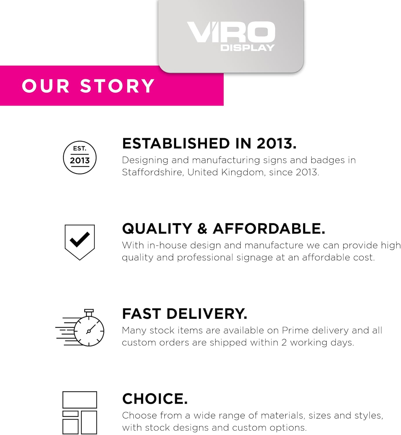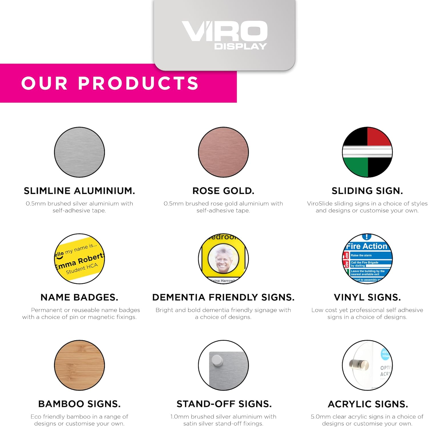 If you’re searching for a unique, tailor-made signage solution, you’ve come to the right place. At Viro Display, we specialise in creating custom signs to meet any need. Whether you require office door signs, plaques, wall signs, sliding signs, toilet signs, or any other type of signage, our expert team is here to help. We can create bespoke sizes, use different materials and print whatever you want.