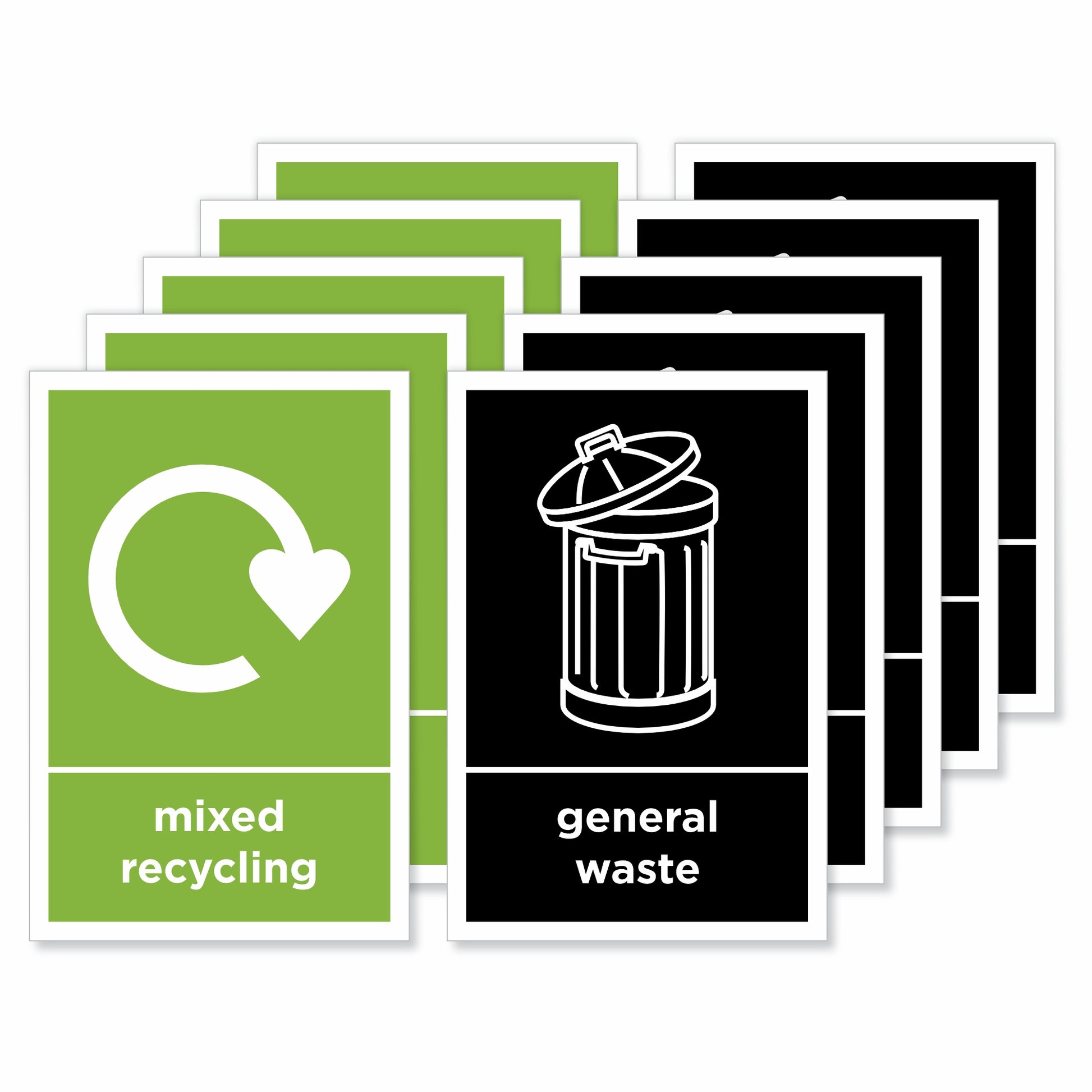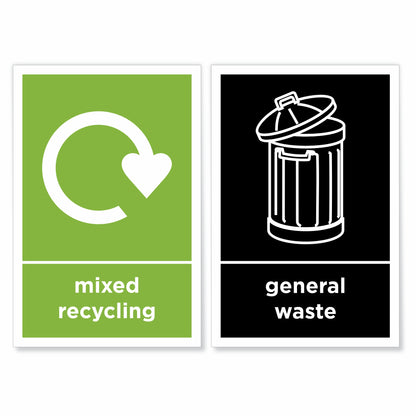 Mixed recycling and general waste self-adhesive vinyl signs / stickers. Weatherproof, waterproof and UV resistant for years of indoor or outdoor use. Clearly identify the correct bins and encourage recycling. Quickly apply to any clean, dry and flat surface. Ideal for use in commercial, residential and public buildings. Size: 100 x 150mm.