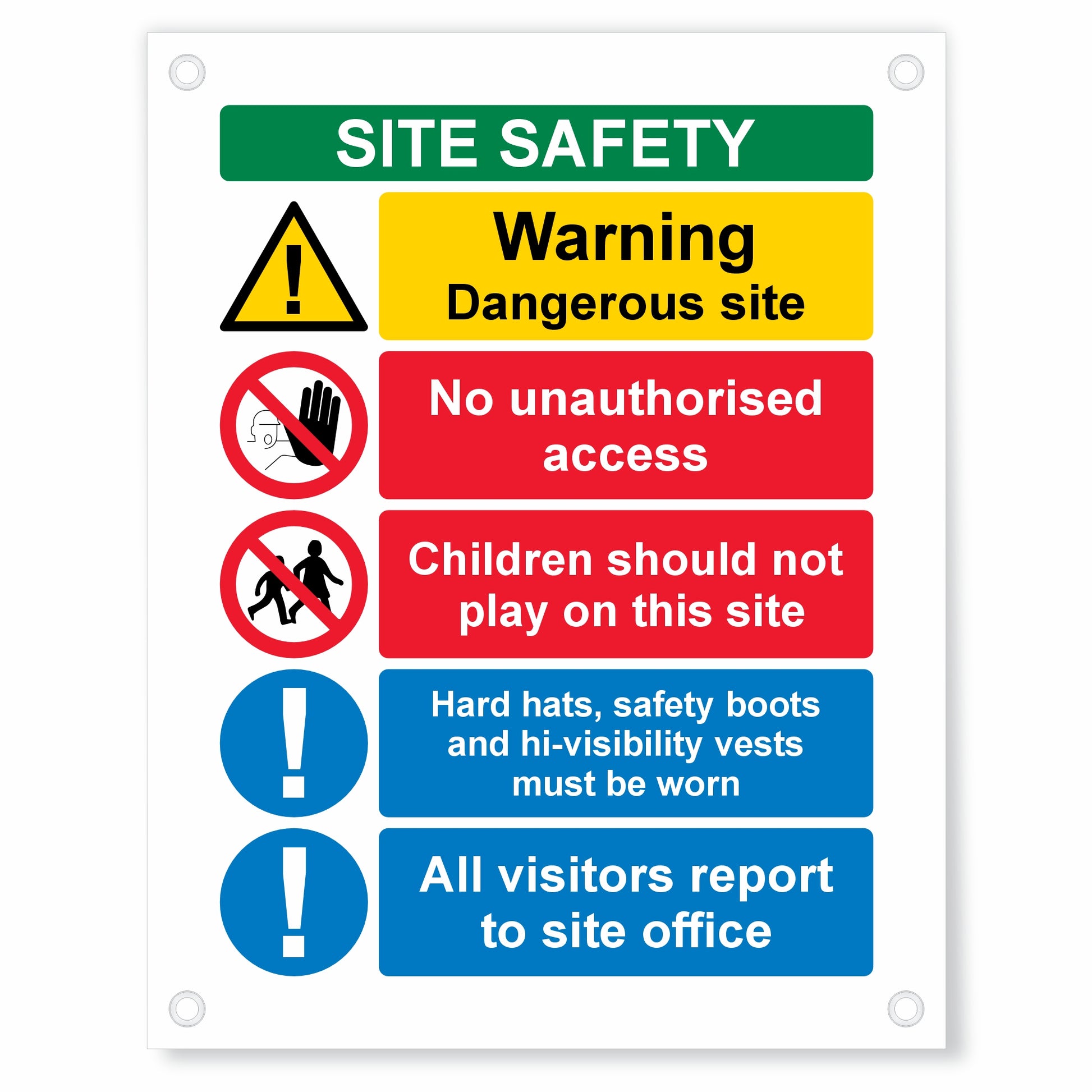 Multi-message 5 point heavy duty site safety sign. 450gsm PVC banner material, hemmed and eyeletted, flame-resistant to DIN4102. Durable and easy to fit with zip ties or screws and can be rolled up for easy storage. Our safety signs meet the requirements of current legislation, including BS EN ISO 7010. Size: 550 x 700mm.