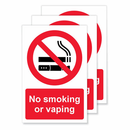 No smoking or vaping self-adhesive vinyl signs. Weatherproof, waterproof and UV resistant for years of indoor or outdoor use. Our safety signs meet the requirements of current legislation, including BS EN ISO 7010. Quickly apply to any clean, dry and flat surface. Ideal for use in commercial, residential and public buildings. Size: 100 x 150mm.